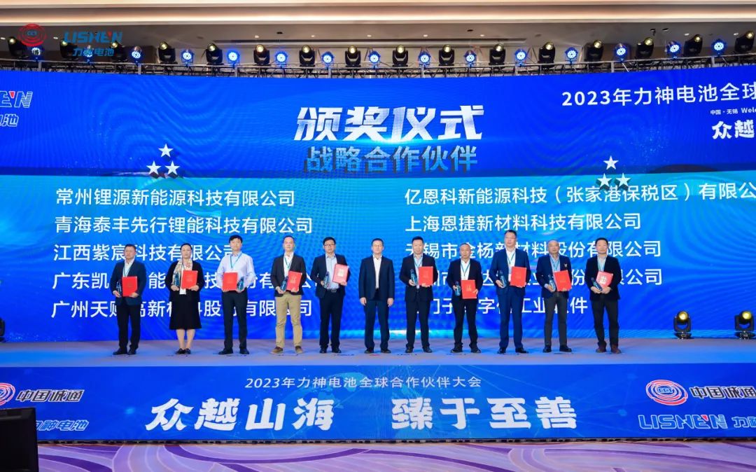 2023年11月15日,,,,,,,上海jdb电子网站获力神电池“战略合作伙伴”称呼,,,,,,,jdb电子网站股份副总裁吴量(右五)领奖。。。。。。。。