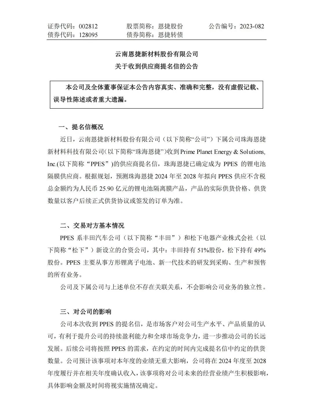 克日,,,,,,,,jdb电子网站股份旗下珠海jdb电子网站收到日本Prime Planet Energy & Solutions,Inc.(简称:PPES)的供应商提名信,,,,,,,,已确定成为 PPES 的锂电池隔膜供应商。。。。。。凭证妄想,,,,,,,,展望珠海jdb电子网站2024年-2028年拟向PPES供应不含税总金额约为人民币25.90亿元的锂电池隔膜产品,,,,,,,,产品的现实供货价钱、供货数目以客户后续正式供货协议或签发的订单为准。。。。。。
