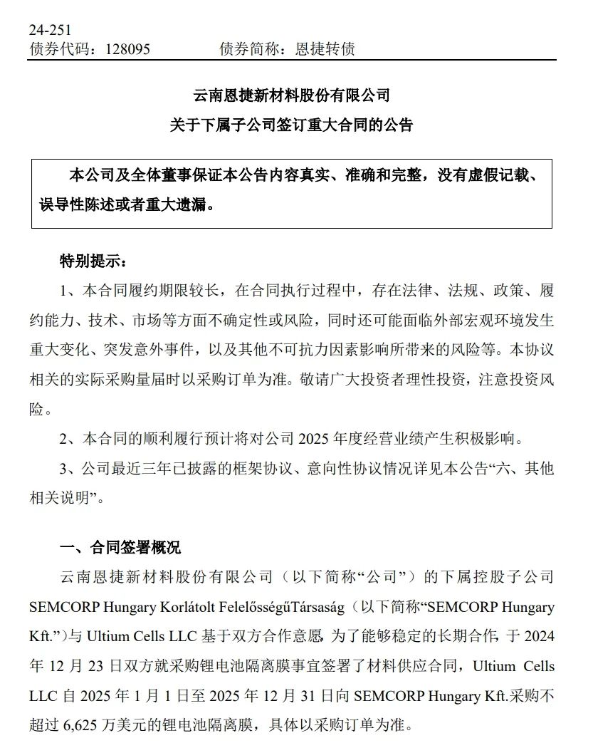 12月23日,,,,,,,,jdb电子网站股份披露控股子公司匈牙利jdb电子网站与美国Ultium Cells LLC基于双方合作意愿,,,,,,,,Ultium Cells LLC自2025年1月1日至2025年12月31日向匈牙利jdb电子网站采购不凌驾6,625万美元的锂电池隔膜,,,,,,,,详细以采购订单为准。。。。。。。